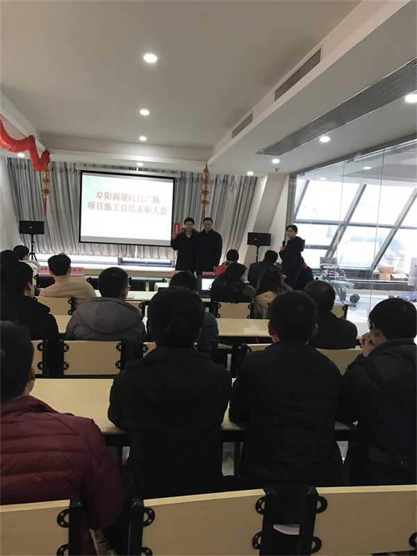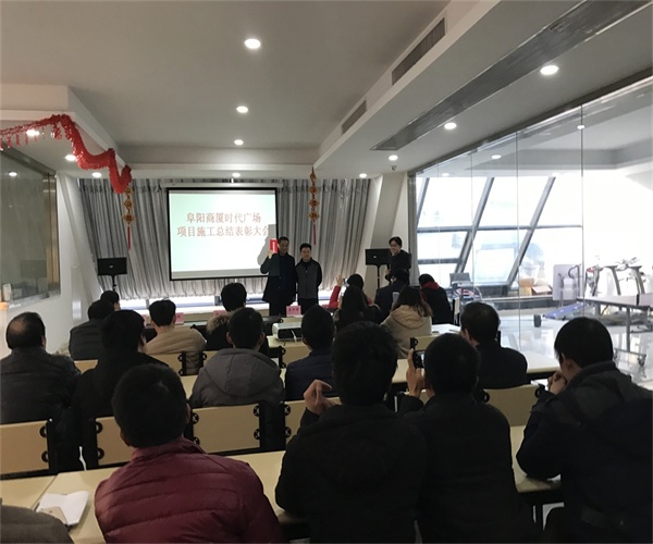 2017年2月9日下午4点,在公司电教室举办了阜阳商厦时代广场项目施工总结表彰大会。该项目于2016年9月8日开工,工期紧迫,施工过程复杂,面对各种困难和挑战,项目现场人员团结协作、顽强拼搏、迎难而上,历经4个月的奋战,现已圆满地完成了施工任务。