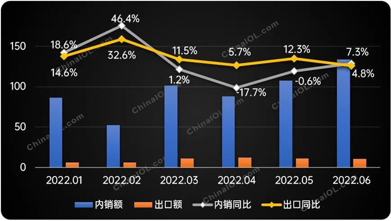 产业在线监测数据显示,2022年6月中央空调市场规模达144.4亿元,同比增长7.09%,其中多联机、离心机组增长明显高于整体增速。内销额为133.9亿元,同比增长7.3%,对比5月增幅明显大幅提升,环比上升21.5%,实现连续两个月的大幅增长;出口额为10.5亿元,同比增长4.8%,出口增速有所下降。Top5品牌格局依旧稳定,部分品牌实现20%以上的强劲增长。