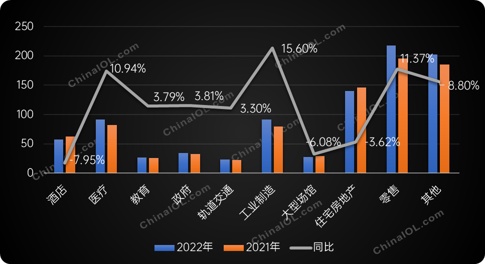 据产业在线数据显示,2022前三季度中央空调内销规模912.07亿元,同比增长5.92%。从细分应用市场竞争格局来看,部分细分市场出现了差异化发展动向。总体而言,在兼顾零售、房地产、工业制造等核心应用领域之外,以医疗、轨道交通等为代表的热门应用场景竞争态势更加激烈。