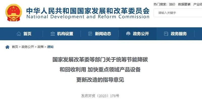 2023年2月20日,国家发展改革委、工业和信息化部、财政部、住房城乡建设部、商务部、人民银行、国务院国资委、市场监管总局、国家能源局发布《国家发展改革委等部门关于统筹节能降碳和回收利用 加快重点领域产品设备更新改造的指导意见》(发改环资〔2023〕178号,以下简称《指导意见》),完善政府绿色采购政策,扩大政府绿色采购范围,加大对符合政策要求高效节能产品设备的政府采购支持力度。