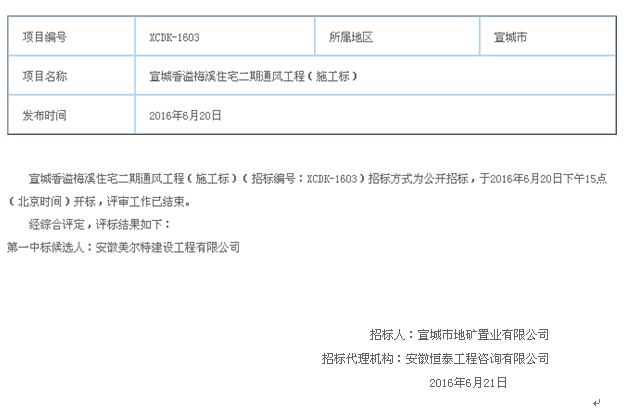 宣城香溢梅溪住宅二期通风工程(施工标)评标结果公示